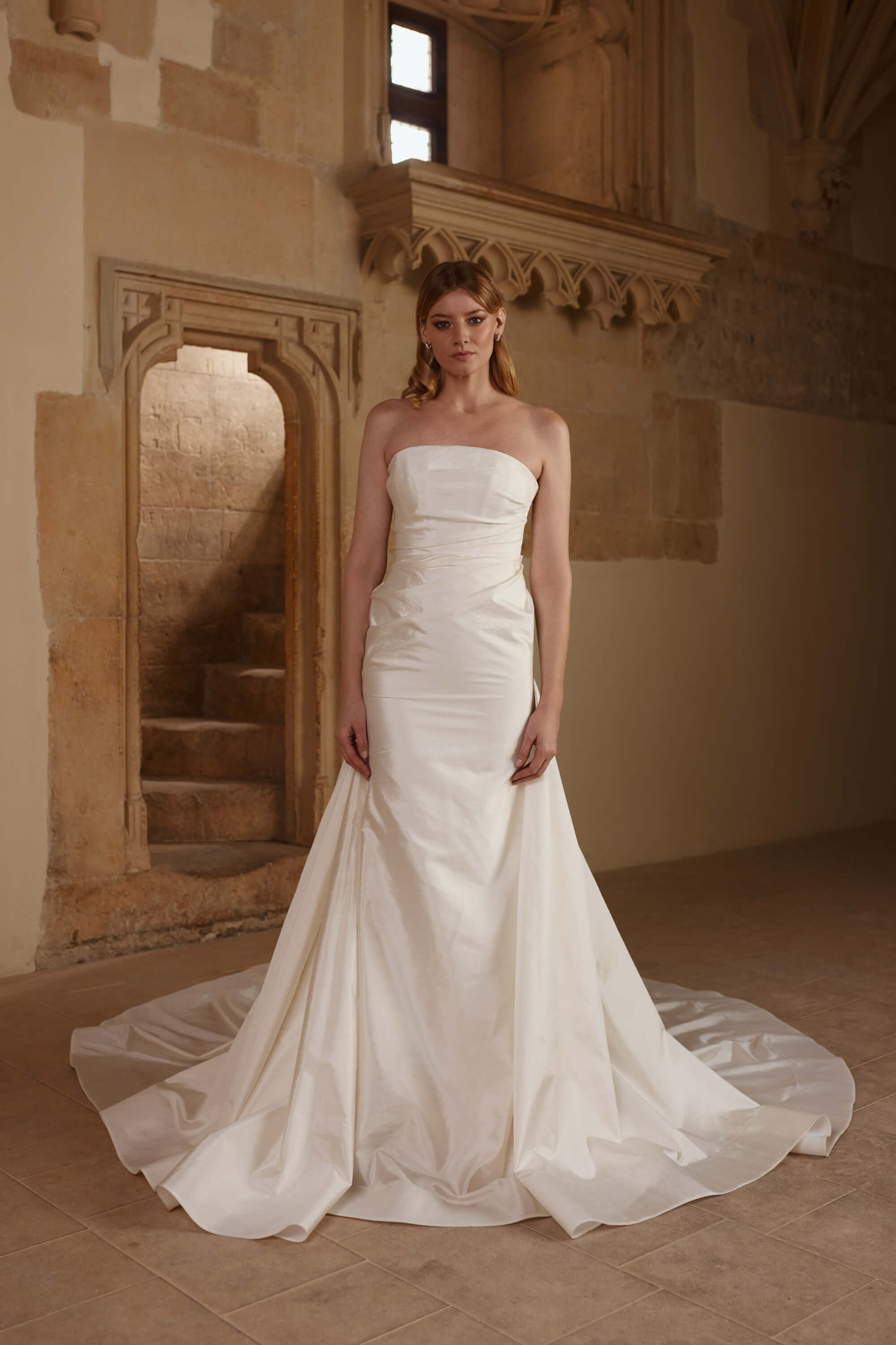 This wedding dress features a refined mermaid silhouette crafted from luxurious silk shantung. The softly draped design enhances the natural shape of the body, while the detachable train adds an elegant and versatile finishing touch for a sophisticated bridal look.