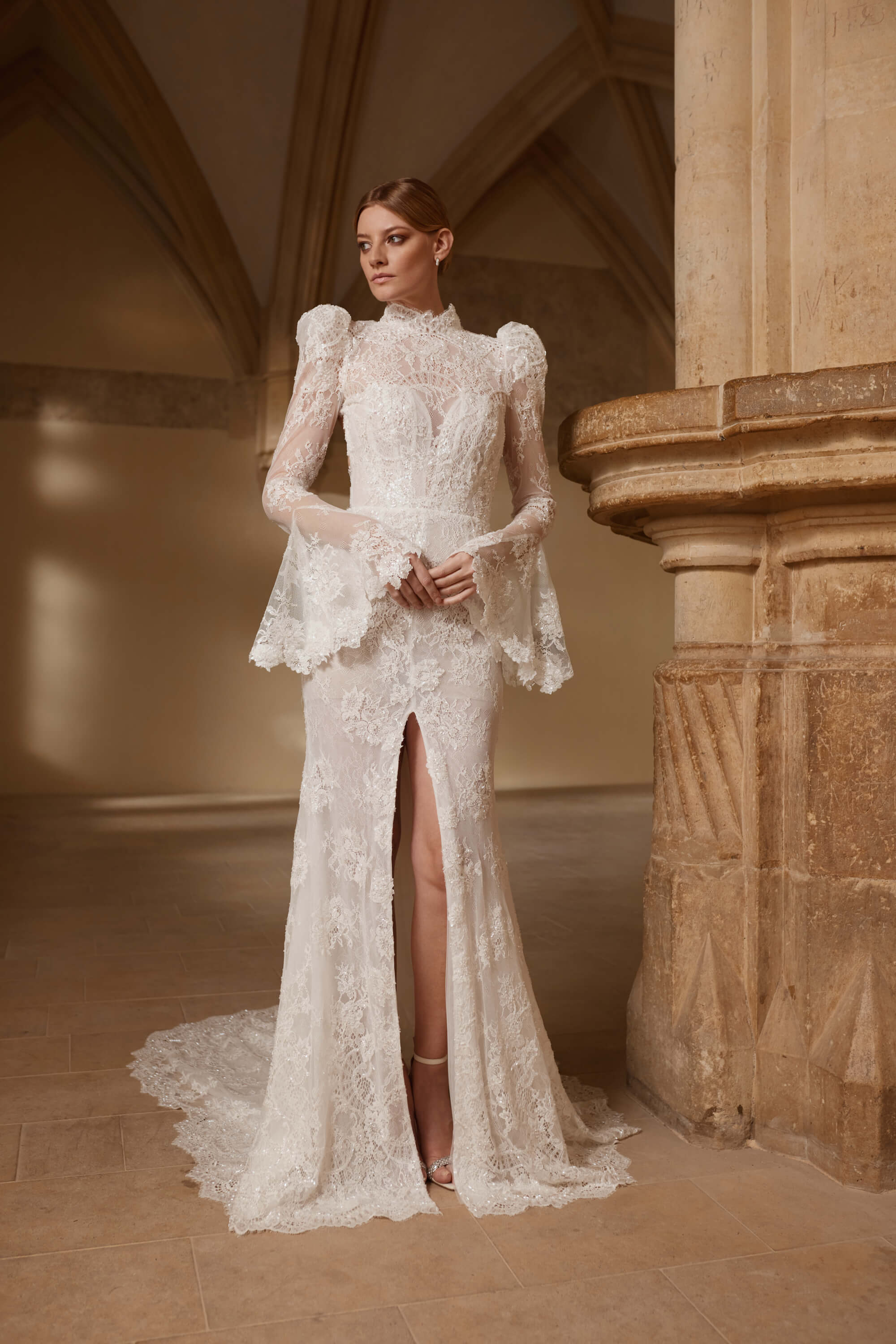 This wedding dress features a striking mermaid silhouette crafted from beaded lace that shimmers with every movement. A bold front slit adds allure, while the architectural shoulders create a strong, sculptural statement. The open back and flowing train complete the design with dramatic elegance and modern sophistication.