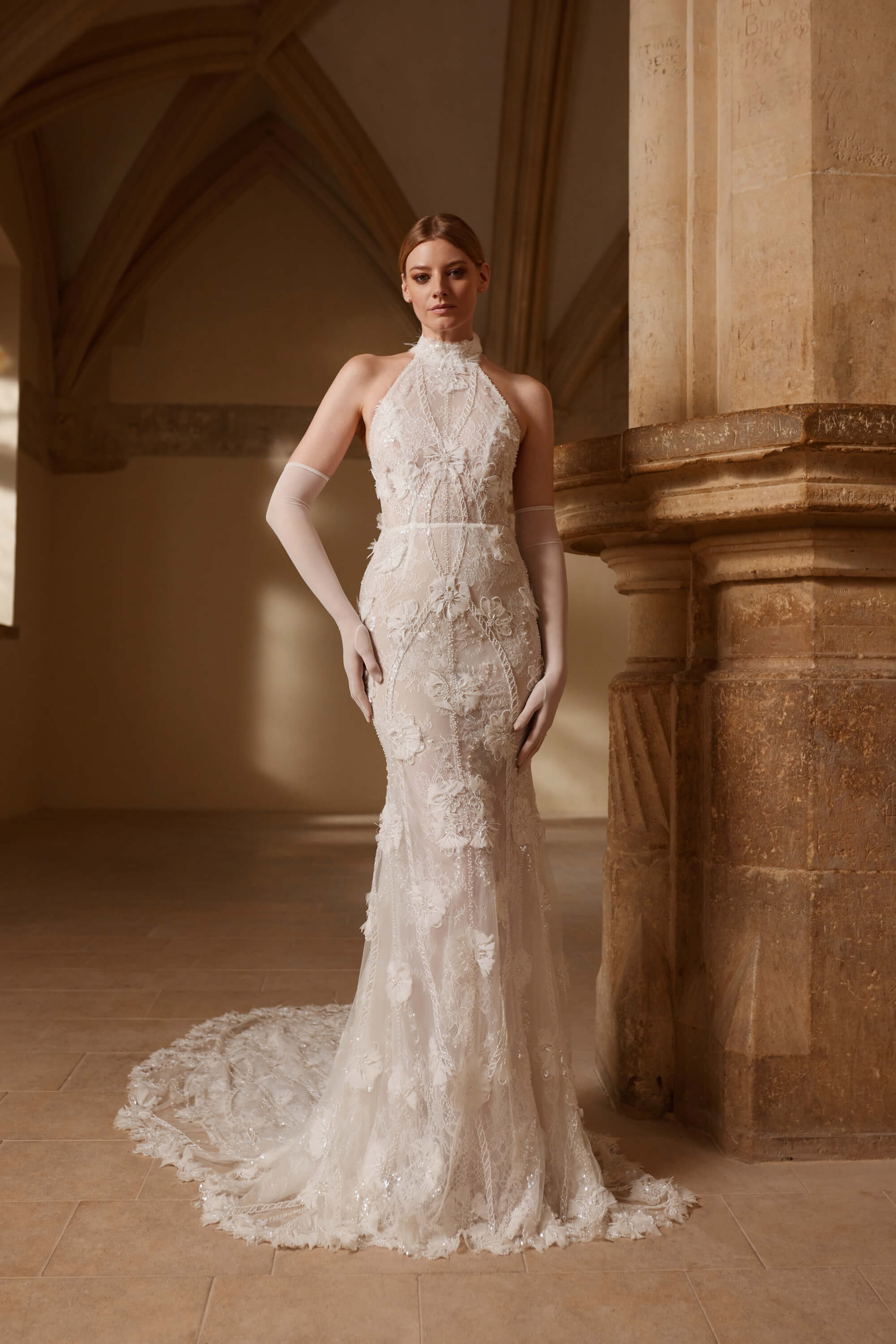 This wedding dress features an elegant mermaid silhouette with a refined halter neckline and a dramatic open back. Crafted from beaded lace accented with delicate feather details and lined with soft Chantilly lace, it flows into a long, graceful train for a striking and luxurious bridal look.