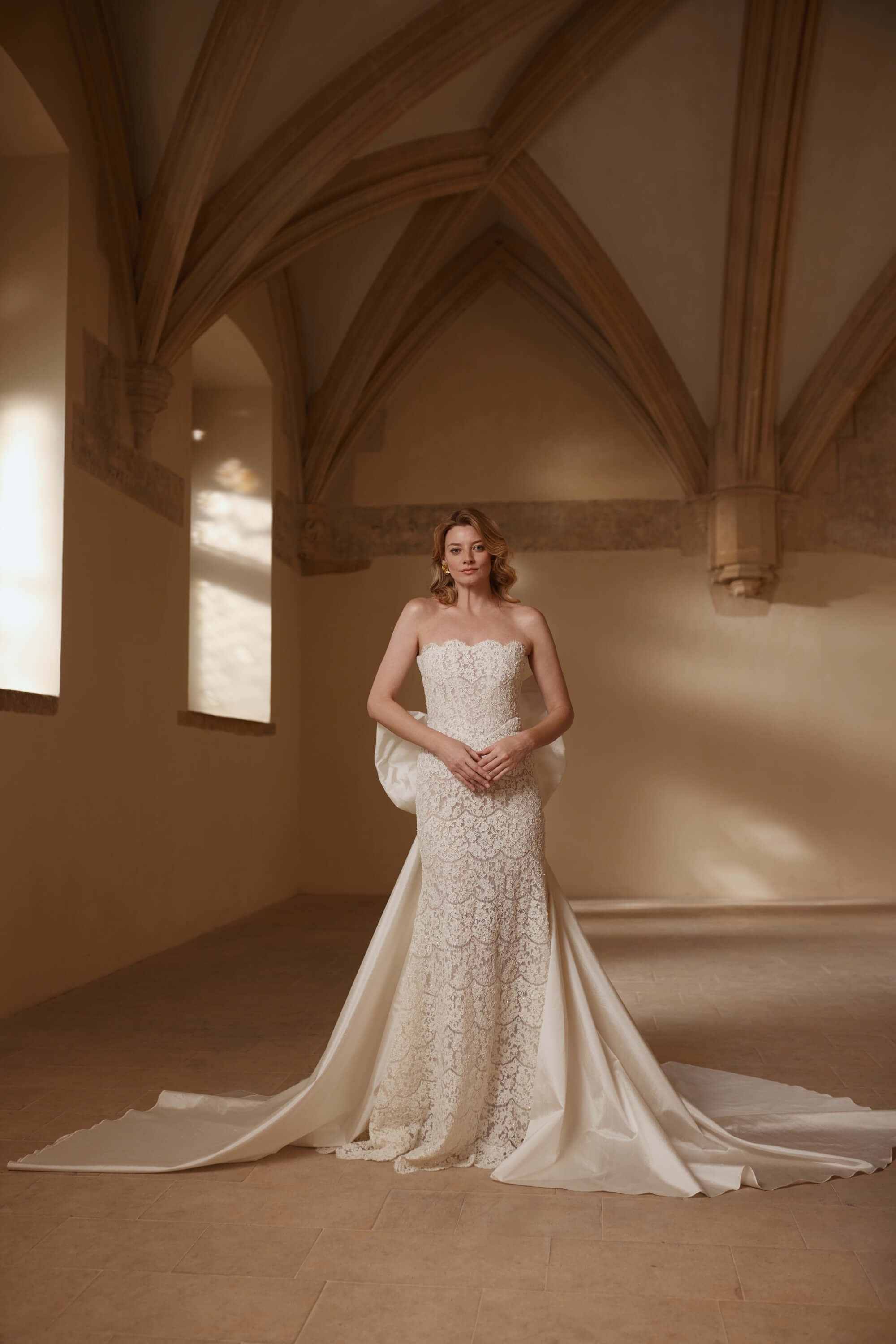 This wedding dress showcases a flattering mermaid silhouette crafted from delicate Chantilly lace, embellished with subtle beading for a soft, luminous effect. A detachable bow train adds a dramatic yet elegant touch, offering versatility and a refined statement for a timeless bridal look.