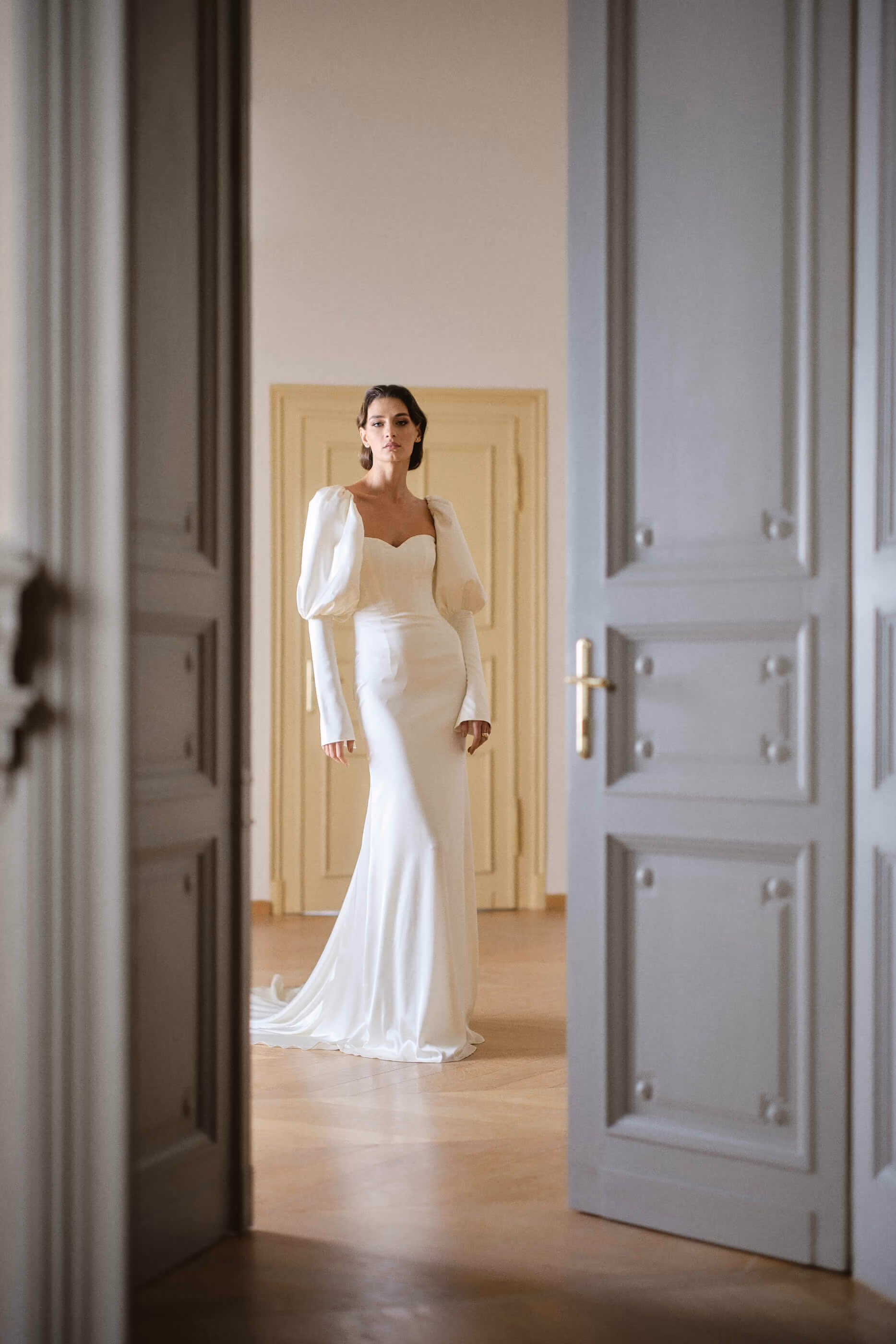 This wedding dress is classic in its fabric, but the puffed sleeves add a touch of uniqueness. It features a sweetheart neckline.